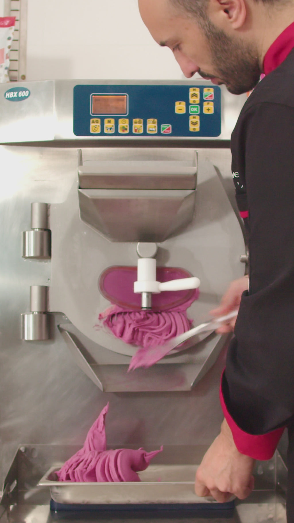 - For SOFT ice cream: Disperse while stirring vigorously with an immersion blender and let the mixture rest for 15 minutes. Strain the mixture through a fine-mesh sieve and pour into the soft-serve machine. Stir the product in the bowl occasionally.